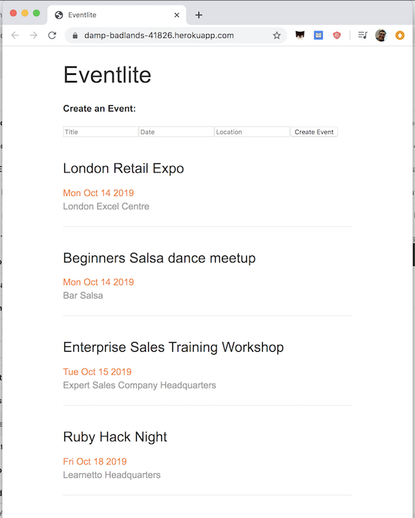 Now let’s refresh and there’s our Eventlite app running on Heroku!