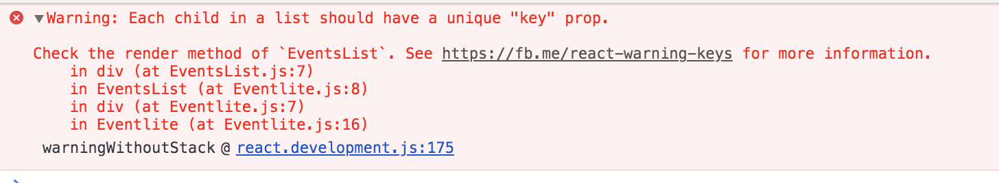 If you look at the developer console in your browser window, you’ll notice that React is throwing a warning: